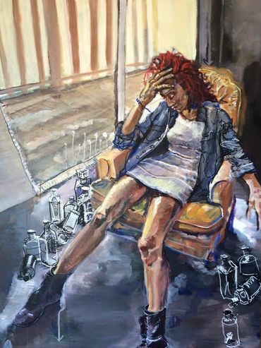 Woman lacking head grabs at the empty space as giant boxes loom overhead